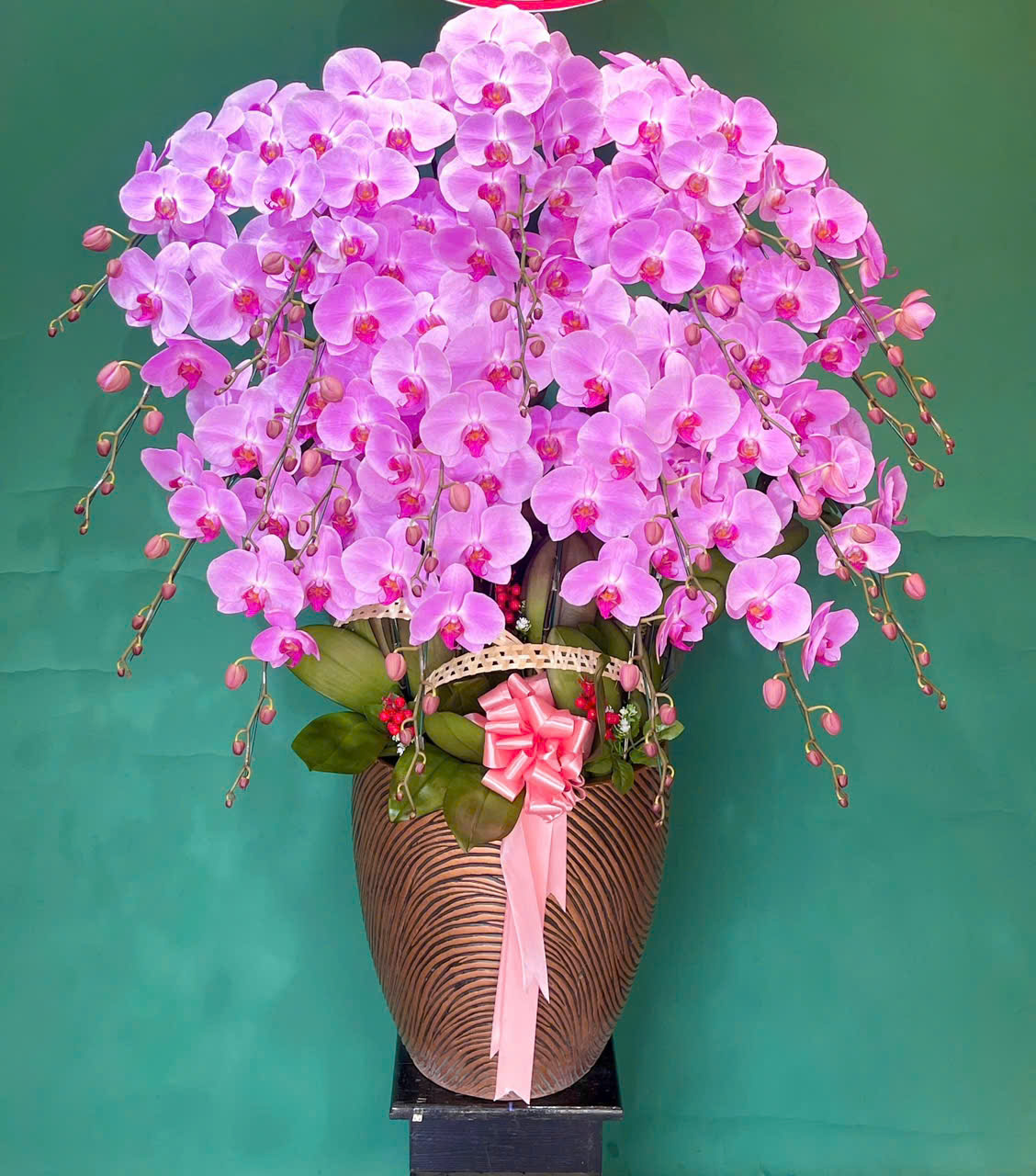Mang vẻ đẹp thanh tao và sang trọng bậc nhất, chậu hoa lan hồ điệp là biểu tượng của sự vương giả, sung túc và may mắn. Từng cành lan được tuyển chọn kỹ lưỡng với những bông hoa to, cánh vươn dài đầy sức sống, màu sắc rực rỡ và độ bền lâu tàn lên đến hàng tháng trời. Đây không chỉ là điểm nhấn hoàn hảo bừng sáng không gian sống, không gian làm việc mà còn là lời chúc bình an, tài lộc trọn vẹn nhất.